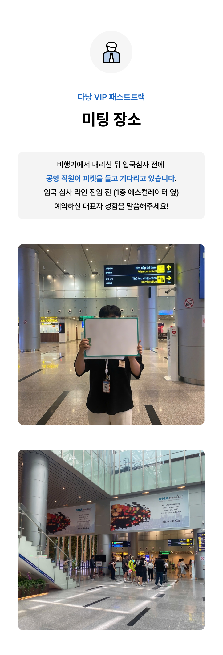 ➤ 다낭 국제 공항 도착 후, 입국 심사 라인 진입 전 (1층 에스컬레이터 옆) 예약자 이름이 적힌 피켓을 들고 있는 공항 직원을 찾아주세요! ➤ 예약하신 대표자 성함을 말씀해주세요!