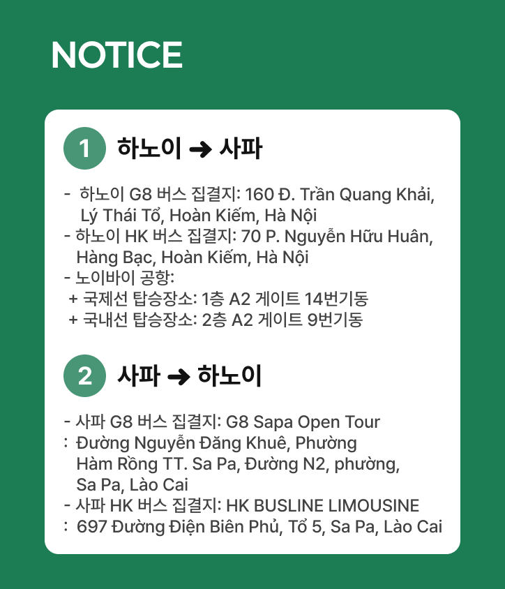 - 사파 시내 호텔 투숙시 호텔까지 드랍 서비스를 제공해 드립니다.