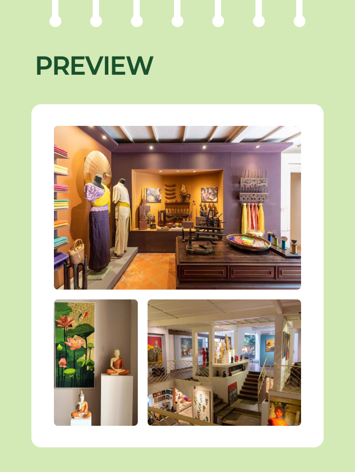 조용하고 아름다운 분위기 속에서 예술가들의 작업을 직접 보고, 캄보디아의 문화와 감성을 담은 특별한 예술품을 감상하거나 구입할 수 있습니다.