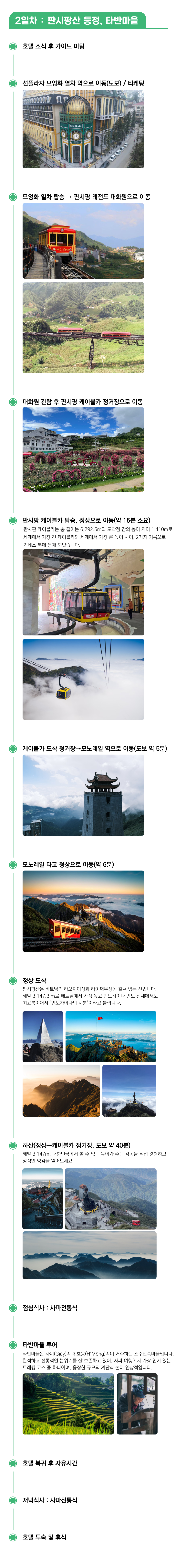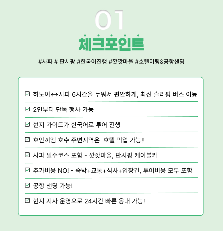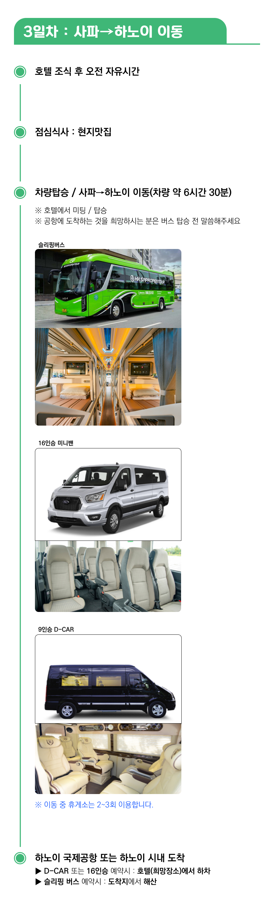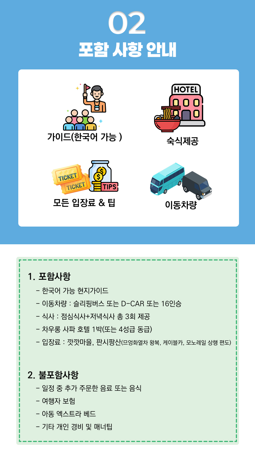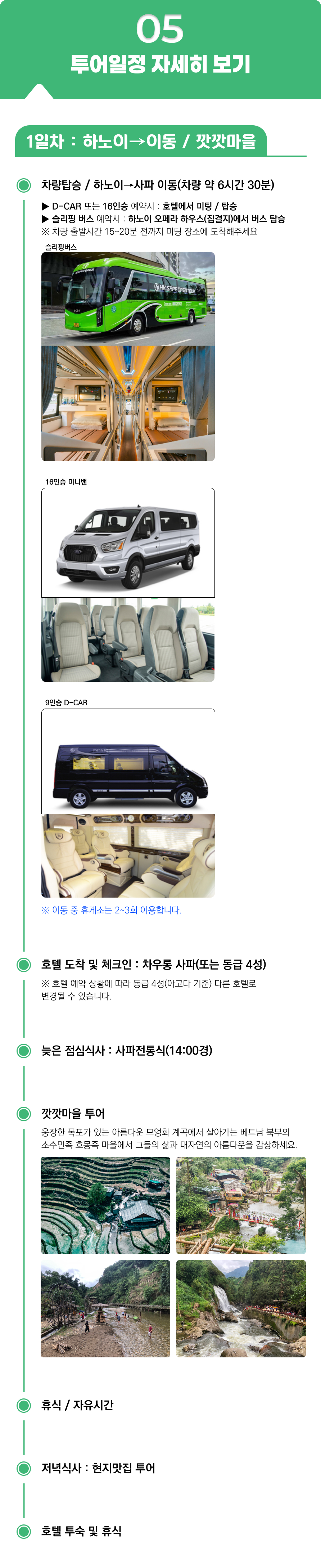 글로 보는 상세일정 (투어시간: 07:00 – 22:00 + 1 DAY) 1일차 07:00 – 차량 탑승 ( 9인승 DCar 호텔 / 16인승 호텔 / 슬리핑 버스: 집결지) 13:45 – 4성 사파 호텔 (어메이징 호텔 4성급 호텔) 체크인 14:00 점심식사 (사파전통식) 14:50 사파 대표 명소 깟깟마을 투어 (2-3시간) 16:50 호텔 복귀 후 자유시간 18:30 저녁식사 (현지 맛집) 후 자유시간   2일차 8:00 호텔 조식 후 가이드 미팅 판시판 관광 * Mương Hoa 기차 (판시판 케이블카<-> 사파) * 사파 ↔ 판시판 왕복 케이블 카 포함 * 판시판 산 모노레일 상행선 1회 포함 11:30 호텔 복귀 후 점심식사 12:00 중식 13:30 자유시간 14:30 슬리핑 버스 또는 16인승 벤 / 9인승 DCar 21:00 – 22:00 하노이 도착 (16인승 호텔앞 / 슬리핑 버스 도착지에서 해산) ※항공지연으로 인한 취소는 캔슬차지가 발생합니다. 예약시 여유시간을 두고 진행해주세요.
