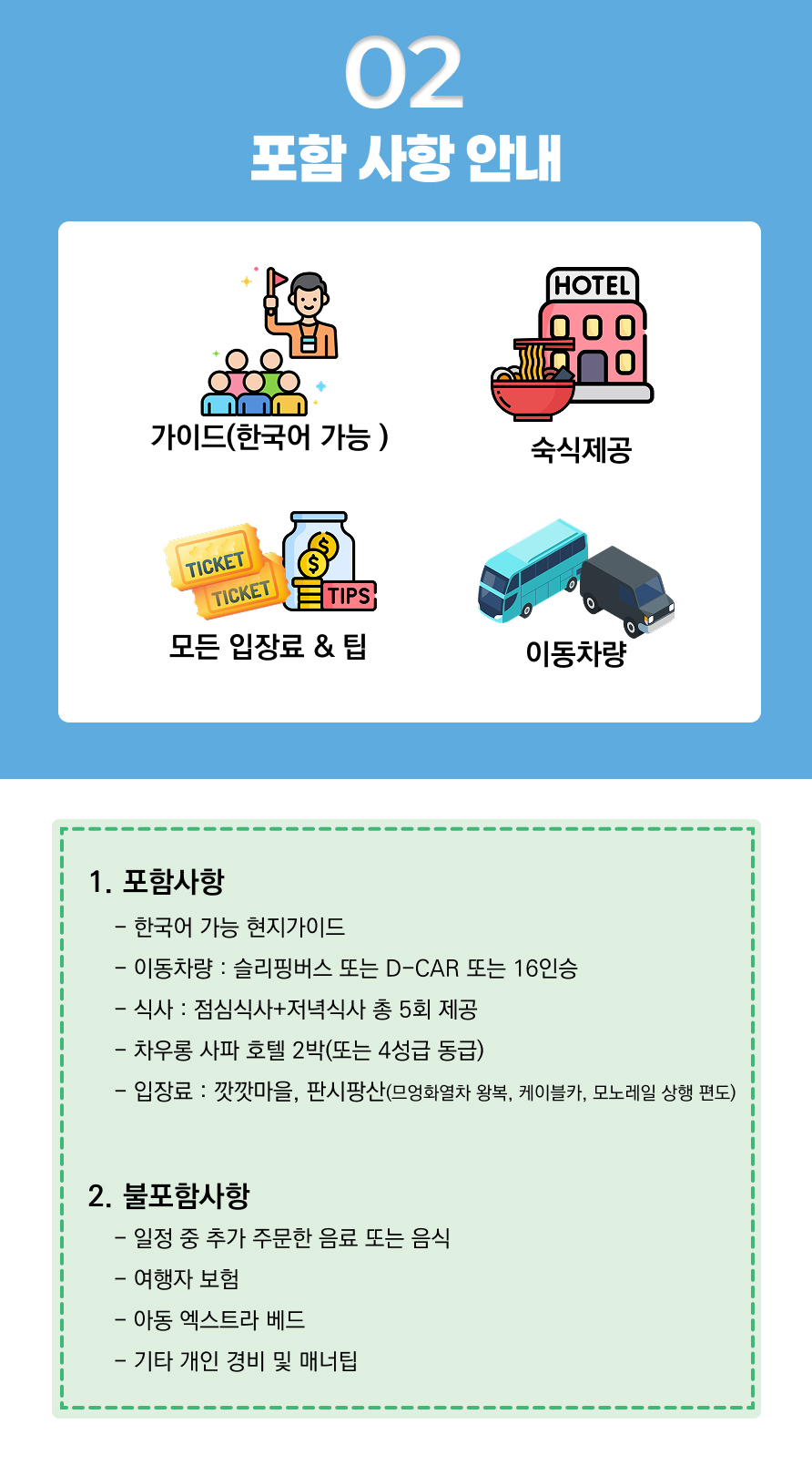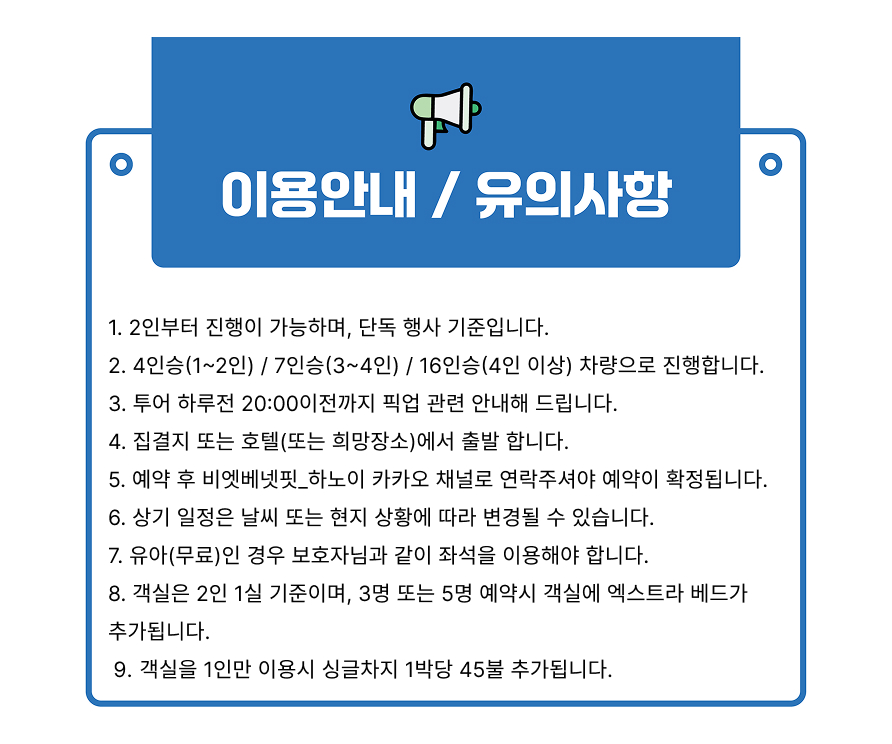 - 투어일 기준 7일전까지 호텔 또는 버스좌석 배정 가능 여부에 따라 변경이 가능합니다.