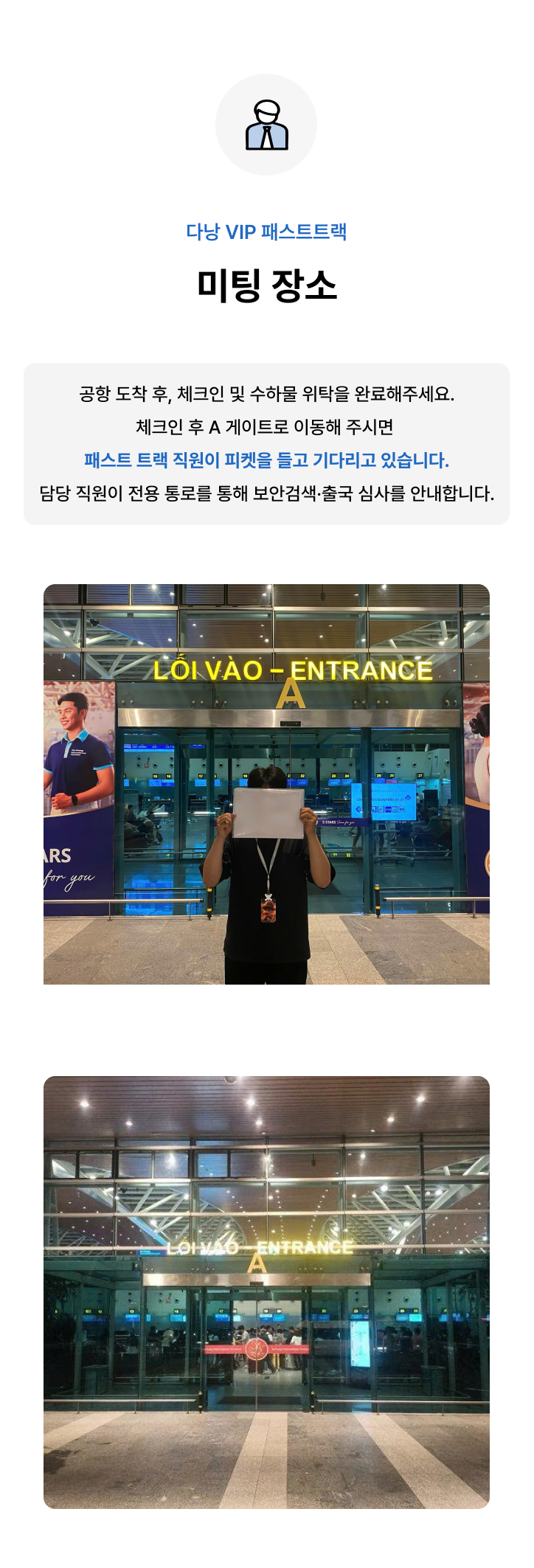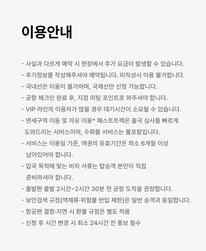 ➤공항 도착 후, 고객 직접 체크인 및 수하물 위탁 완료 ➤체크인 완료 후 지정 미팅 포인트(A 게이트)로 이동 ➤A 게이트 앞에서 패스트트랙 담당 직원과 만나시면 됩니다 ➤패스트트랙 담당 직원이 전용 통로를 통해 보안검색 및 출국 심사를 안내합니다.