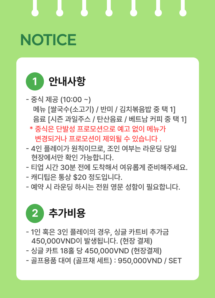- 호텔 ↔ 골프장 왕복 차량은 미포함으로 별도 구매해주셔야 합니다.