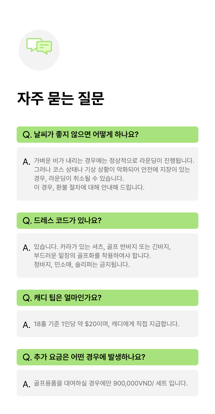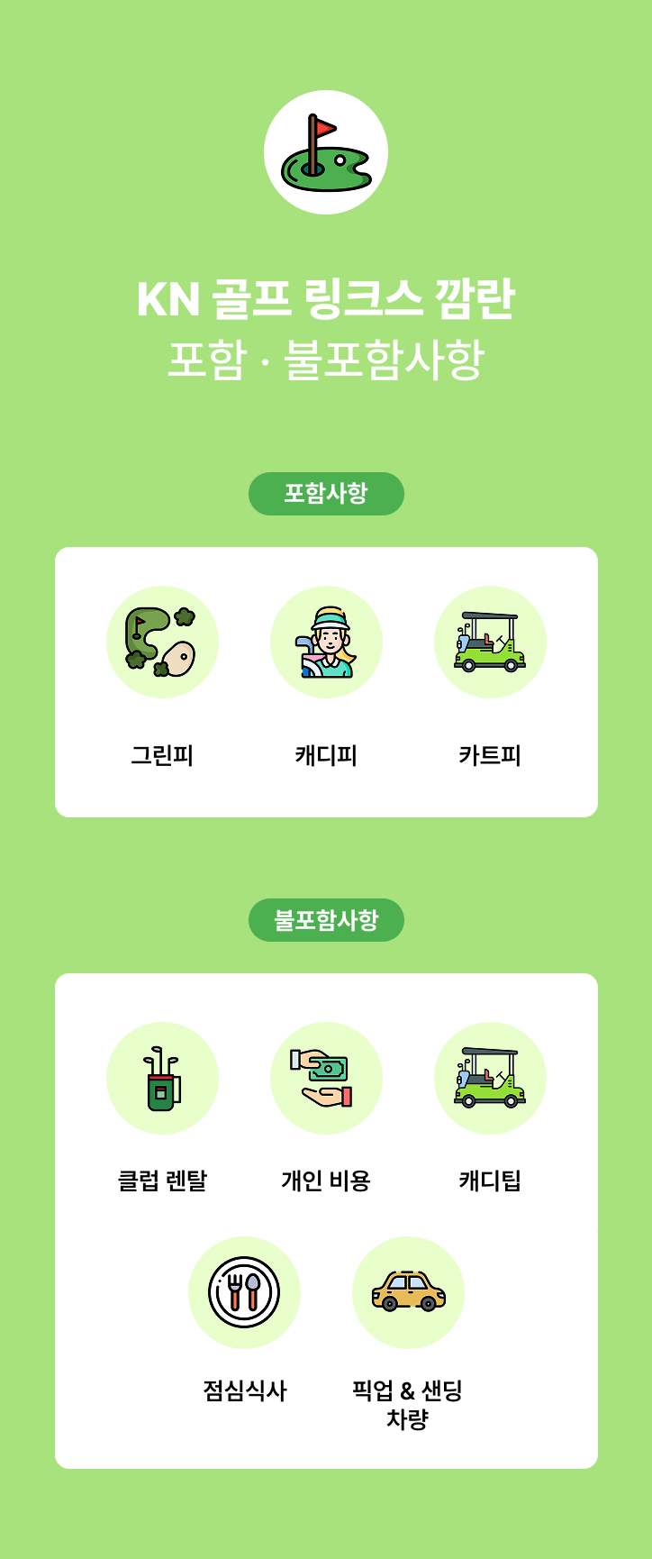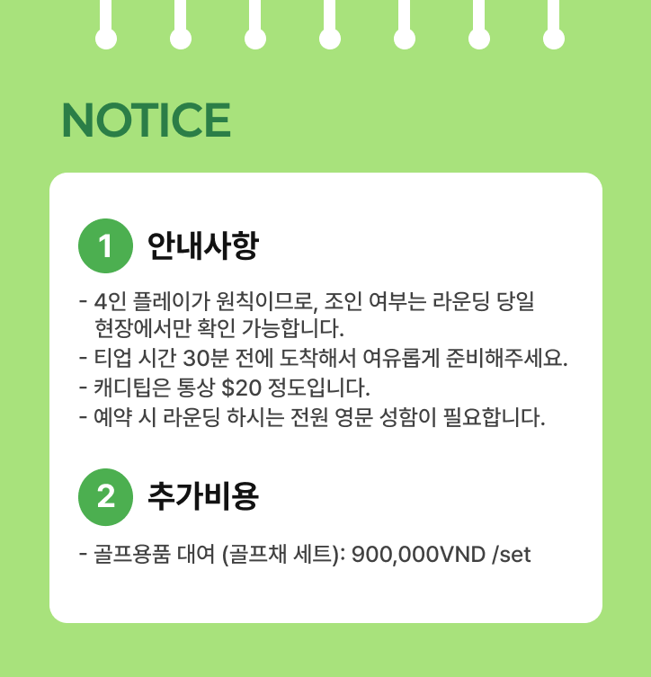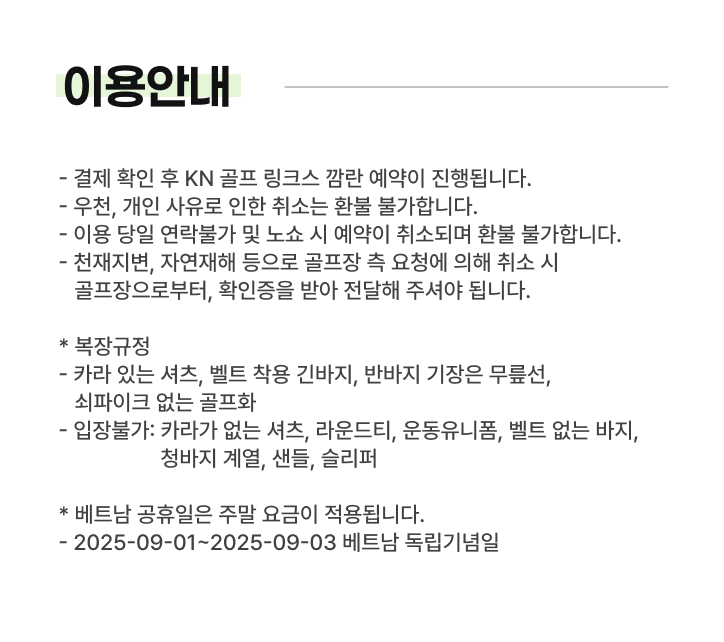 ✅ 포함 사항 Check ❗ - 그린피 - 카트피 (2인 1카트) - 캐디피 (1인 1캐디) 1대당 2명이 탑승 기준이며, 1인 단독 이용 시에는 추가 요금이 부과됩니다. ❌ 불포함 사항 - 캐디팁 (20$ / 1인) - 점심 식사 - 픽업/드랍 차량 - 클럽 렌탈 - 골프화 - 개인 식사비용 📢 참고 사항 - 결제 완료 후 골프장에 예약이 실시간으로 진행되며, 예약 확정까지 시간이 소요될 수 있습니다. - 4인 미만 예약 시 골프장 요청에 따라 조인 될 수 있습니다. - 호텔 ↔ 골프장 왕복 차량은 미포함으로 별도 구매해주셔야 합니다. - 골프클럽 · 골프화 · 우산 렌탈 가능합니다. (현장 결제) - 최초 가능 티옵시간 안내 후 3일 이상 회신 없을 시 자동으로 예약 취소가 진행됩니다. - 금액이나 환율 인하로 인한 취소 후 재결제가 불가합니다. - 기타 문의 사항은 비엣베네핏_나트랑 채널로 연락 주시면 안내해 드리겠습니다.