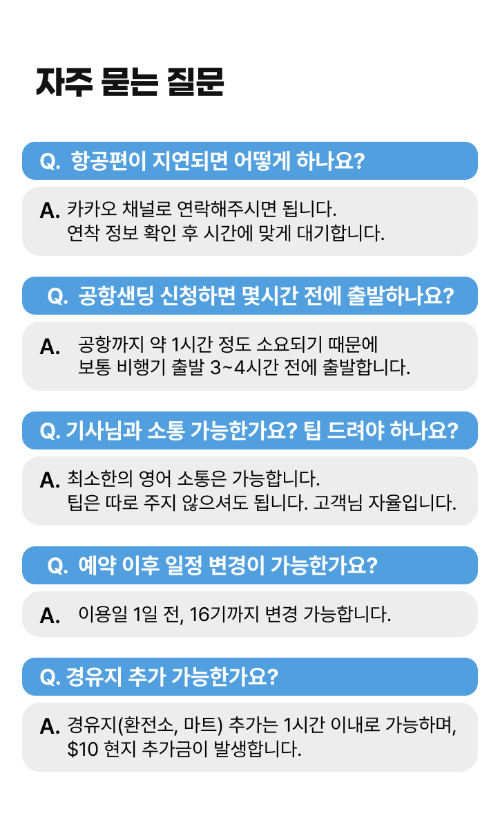 • 공항 픽업 시 : 공항 출구 앞, 피켓(고객 성함)미팅
