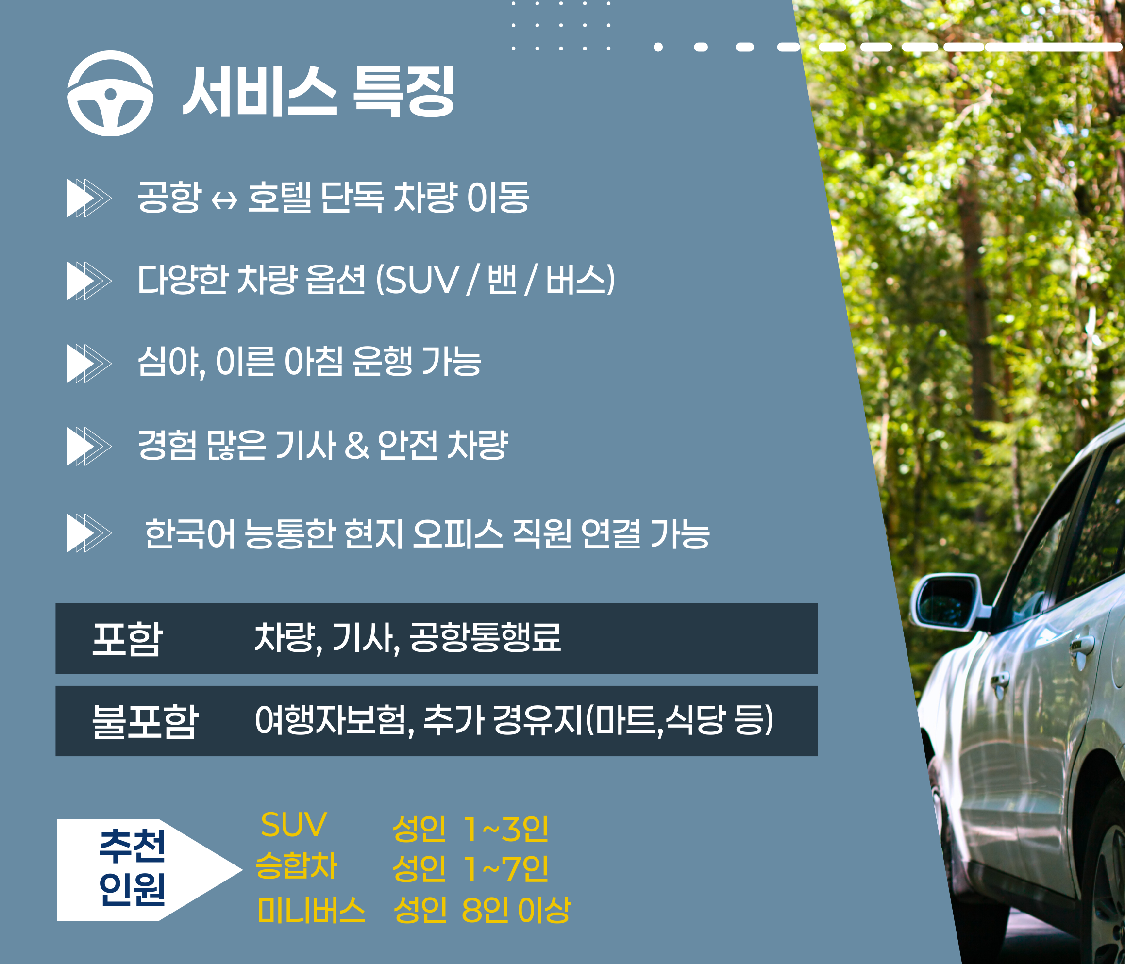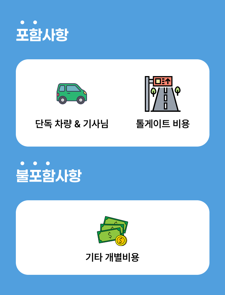 • 차량비, 기사비, 톨게이트비, 세금