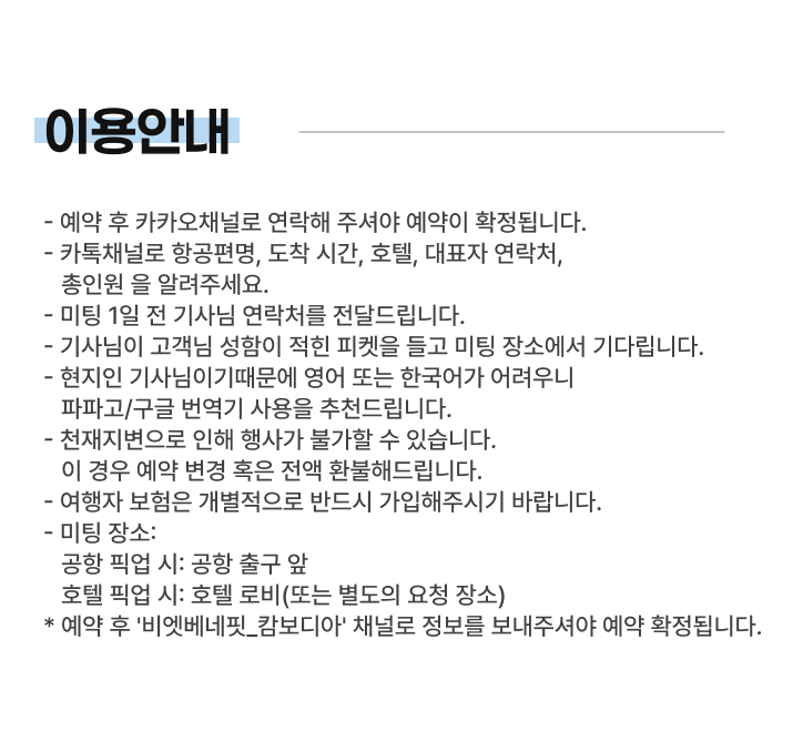 • 비용 결제 후 카톡채널 [비엣베네핏-캄보디아]로 연락하여 필요 정보 전달해주세요.