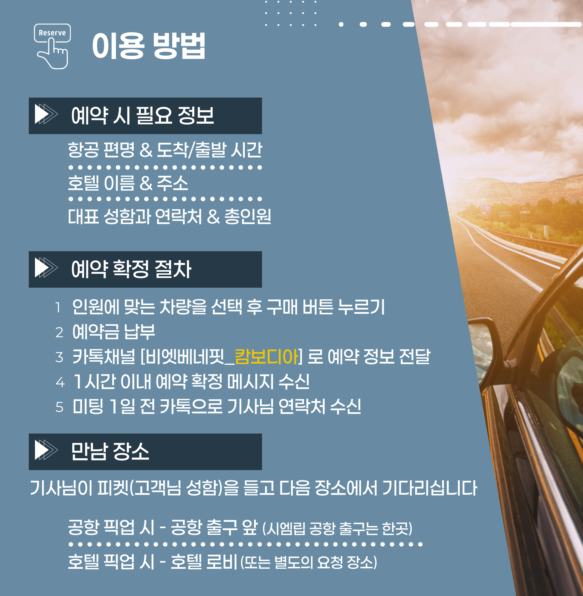 • 미팅 1일 전 배정 차량 및 기사님 연락처 전달