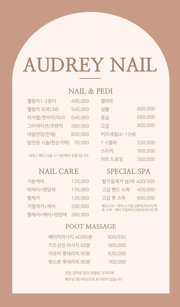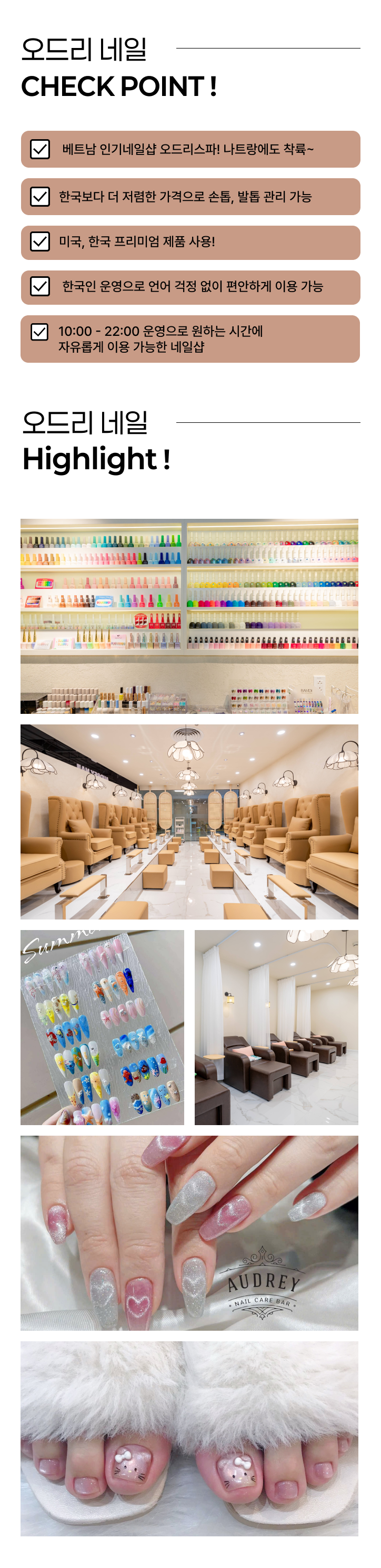 ✨ Audrey Nail Care Bar – 아름다움과 휴식을 동시에 누리는 공간.손·발톱 관리뿐만 아니라 고급 스파와 마사지 서비스까지, 세련되고 아늑한 분위기 속에서 특별한 시간을 경험해 보세요.