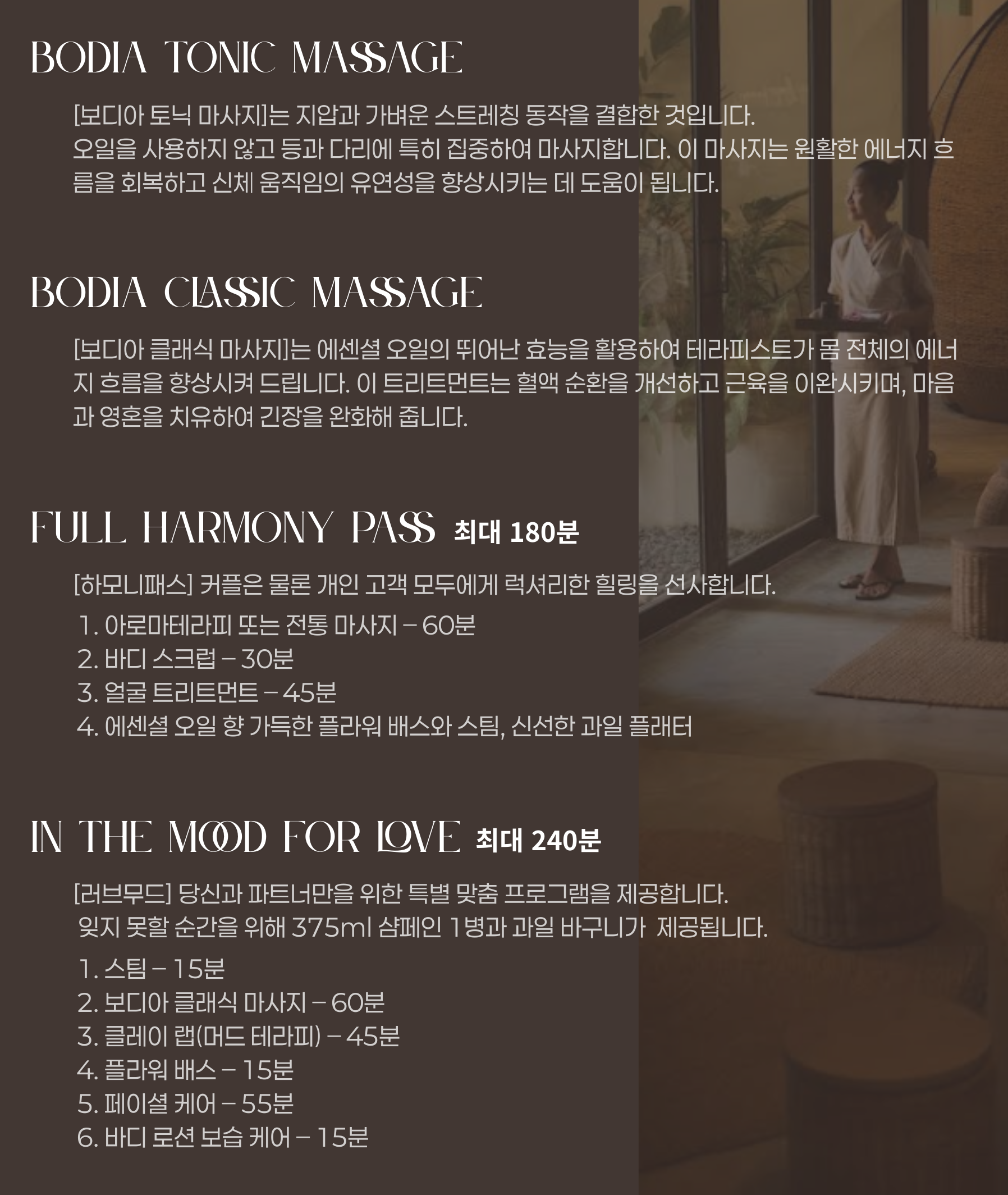 ☛ 스팀 – 15분 / 아로마테라피 – 60분 / 클레이 랩(머드 테라피) – 45분 / 플라워 배스 – 15분 / 페이셜 케어 – 55분 / 바디 로션 보습 케어 – 15분