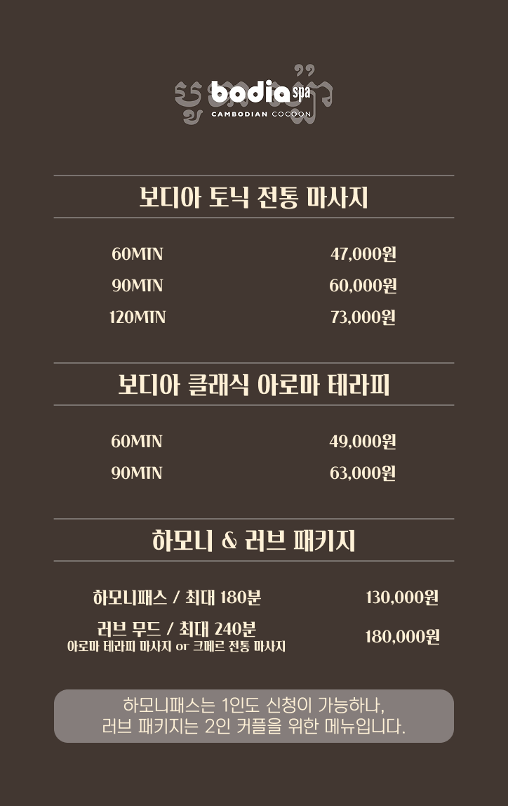 • 불포함 사항 : 마사지사 매너팁 (매너팁은 손님께서 자유롭게 주시면 됩니다), 교통편