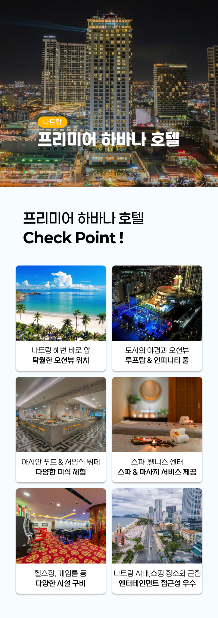 - 나트랑의 중심 번화가인 쩐푸(Trần Phú) 거리 바로 앞, 해변까지 단 몇 걸음 거리의 최적의 위치에 자리하고 있습니다.