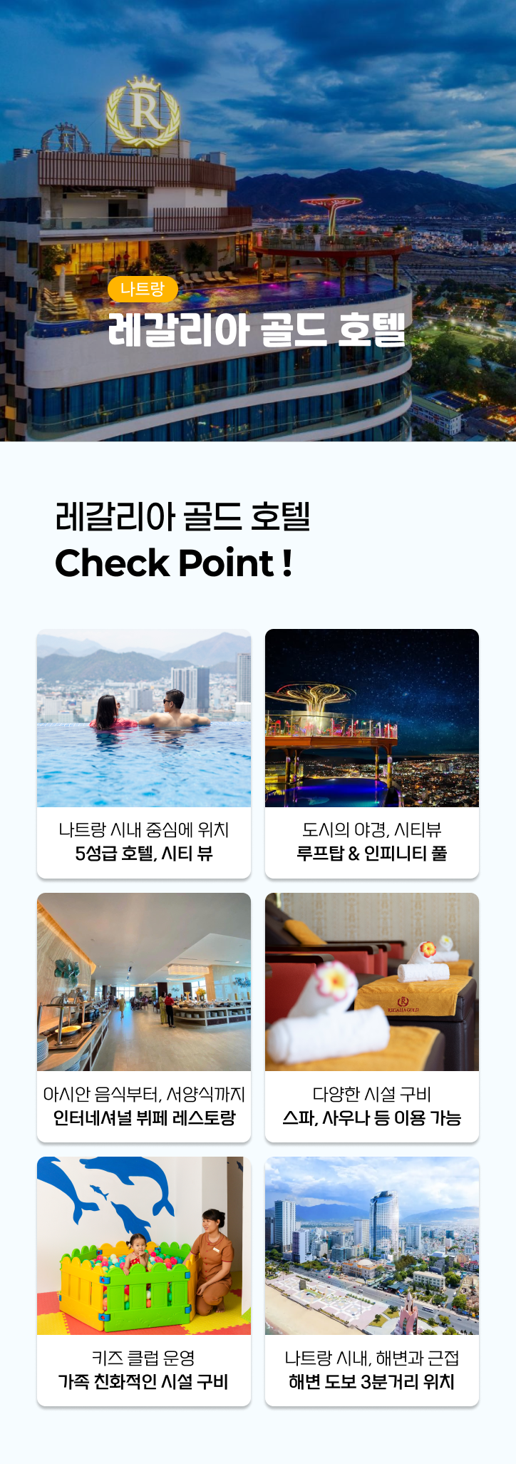 레갈리아 골드 호텔은 나트랑 도심에 위치한 5성급 호텔로, 해변까지 도보로 약 5분 거리에 있어 여행과 휴양을 동시에 즐기실 수 있습니다.