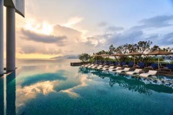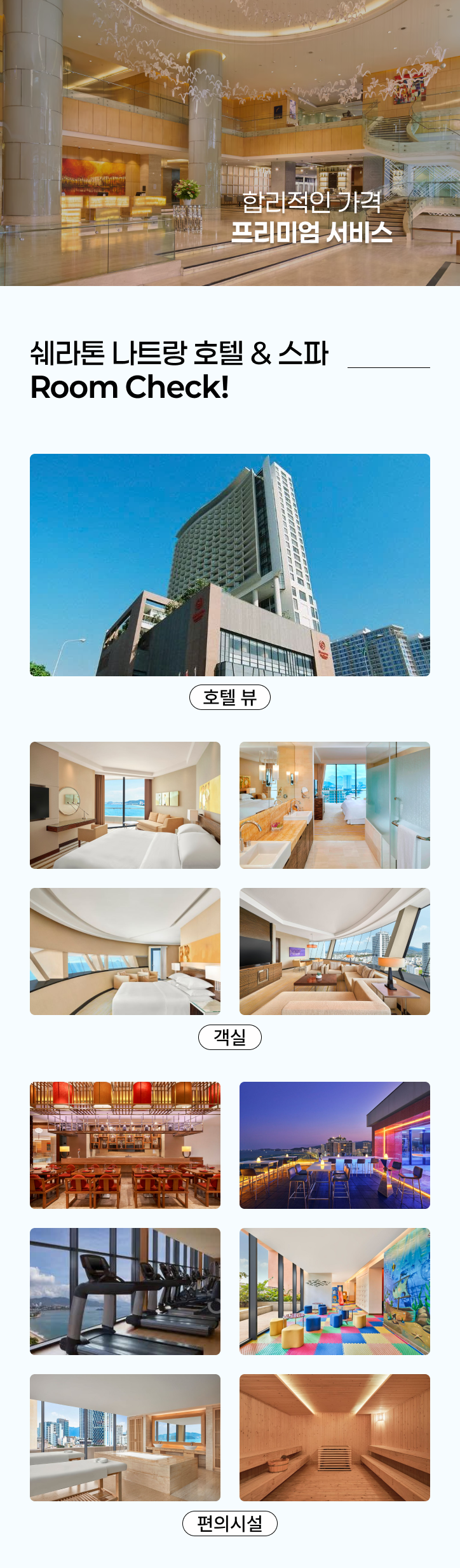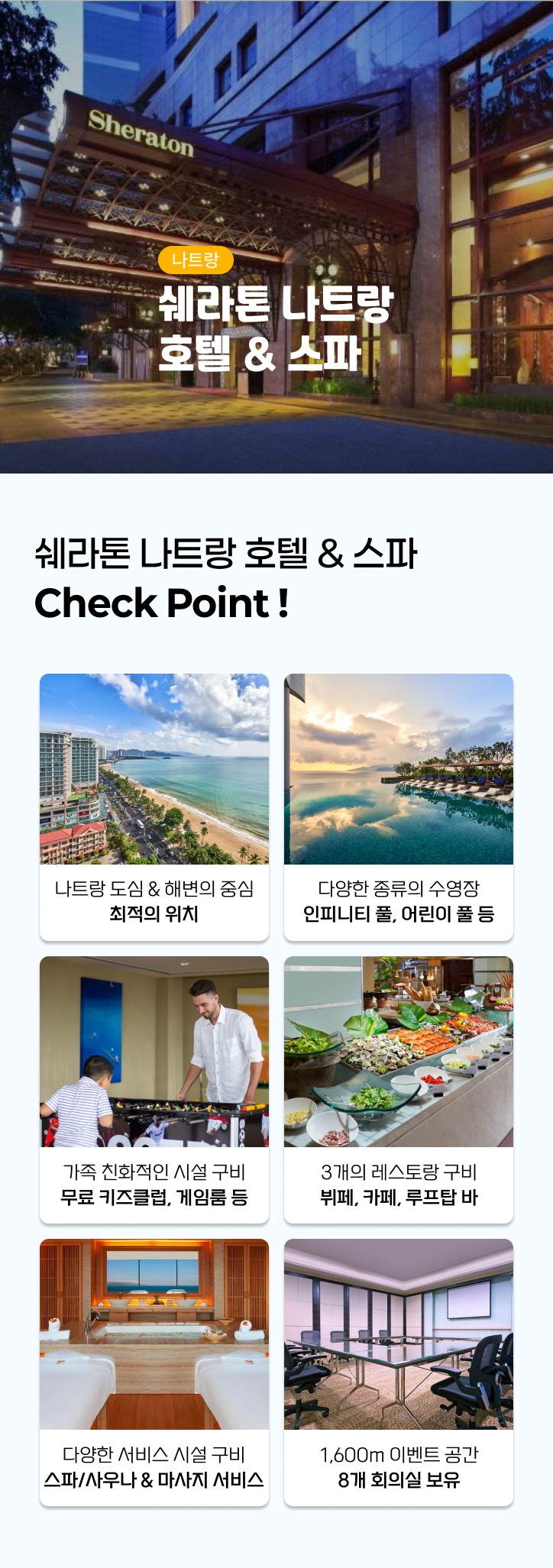 셰라톤 나트랑 호텔 & 스파는 트란푸 거리 해변 바로 옆에 위치한 5성급 국제 브랜드 호텔로, 총 280개의 객실 및 스위트를 보유하고 있으며, 모든 객실에서 환상적인 바다 전망을 제공합니다. 실용적인 해양 테마 인테리어와 편안한 쿠션감의 셰라톤 시그니처 베드, 고급 어메니티를 갖춘 넓은 욕실이 특징입니다.