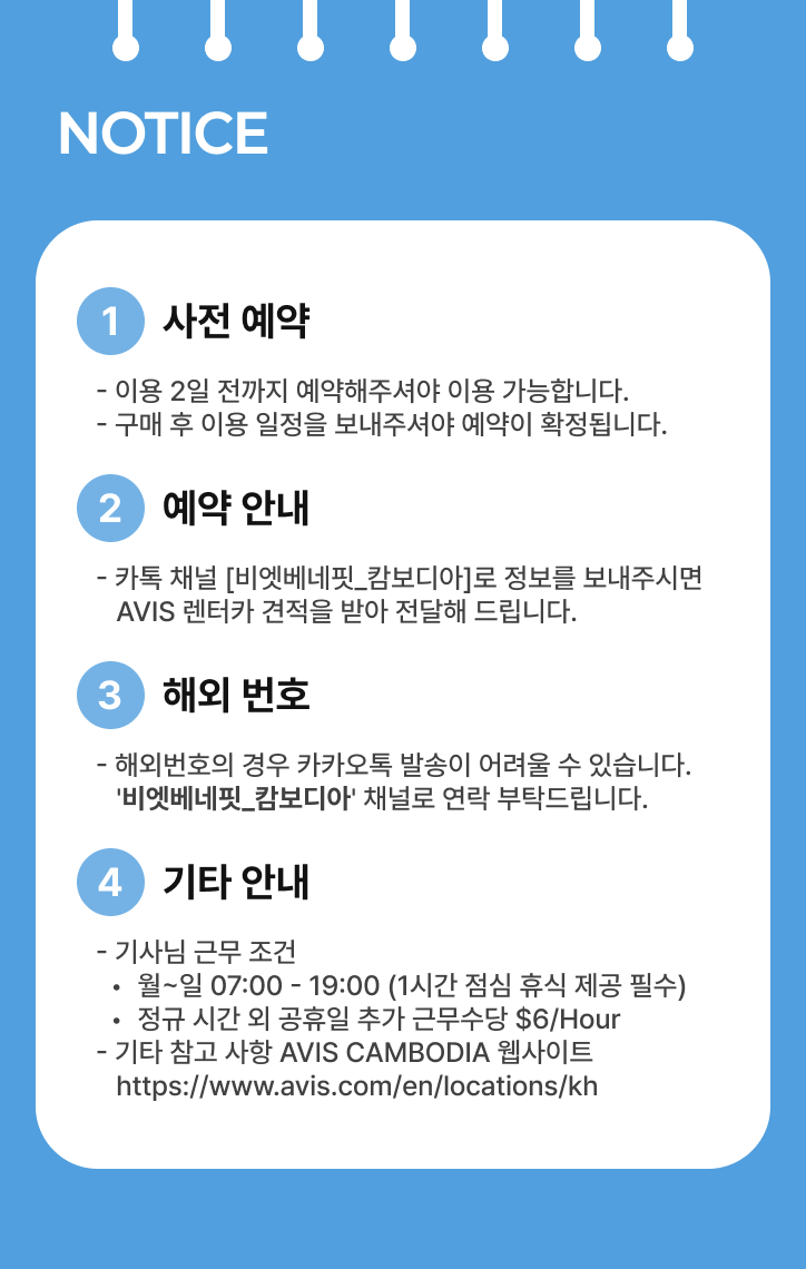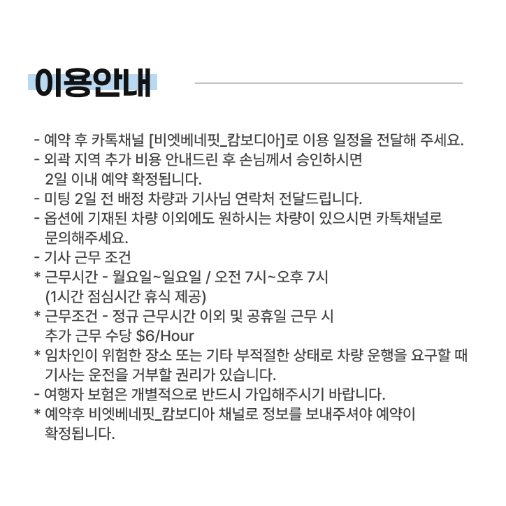 • 비용 결제 후 카톡채널 [비엣베네핏_캄보디아]로 연락하여 버스 이용 일정 전달해주세요.