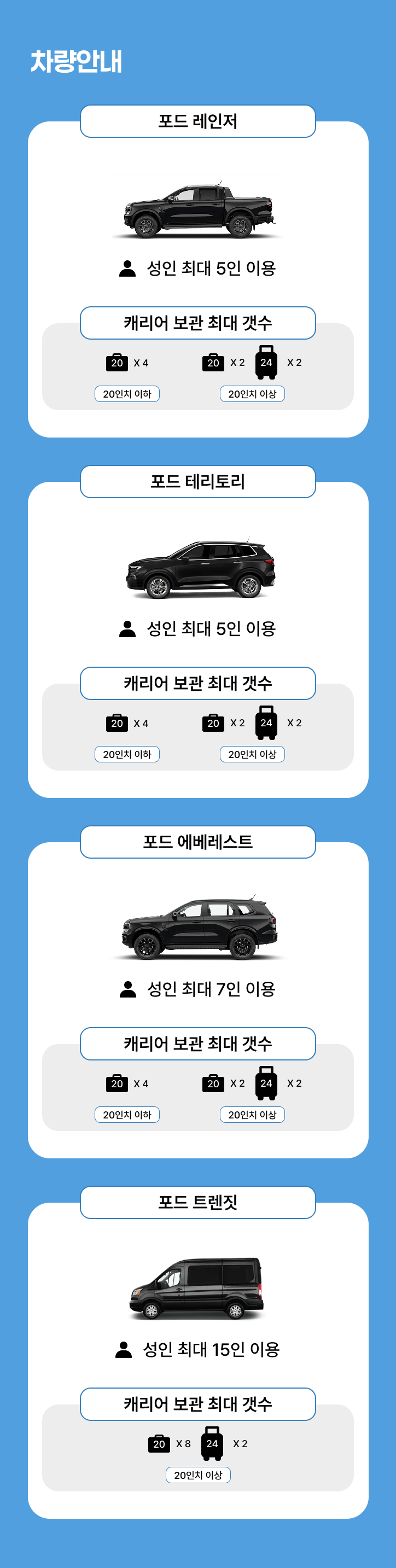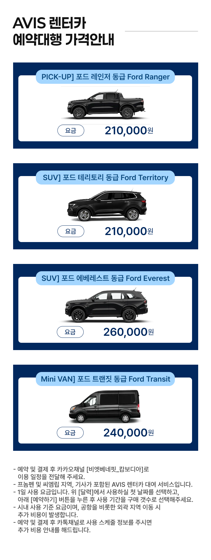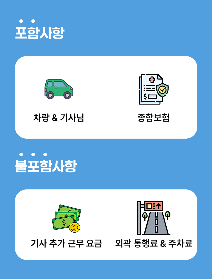 • 포함 사항 : 차량, 기사(식대,숙박), 종합보험