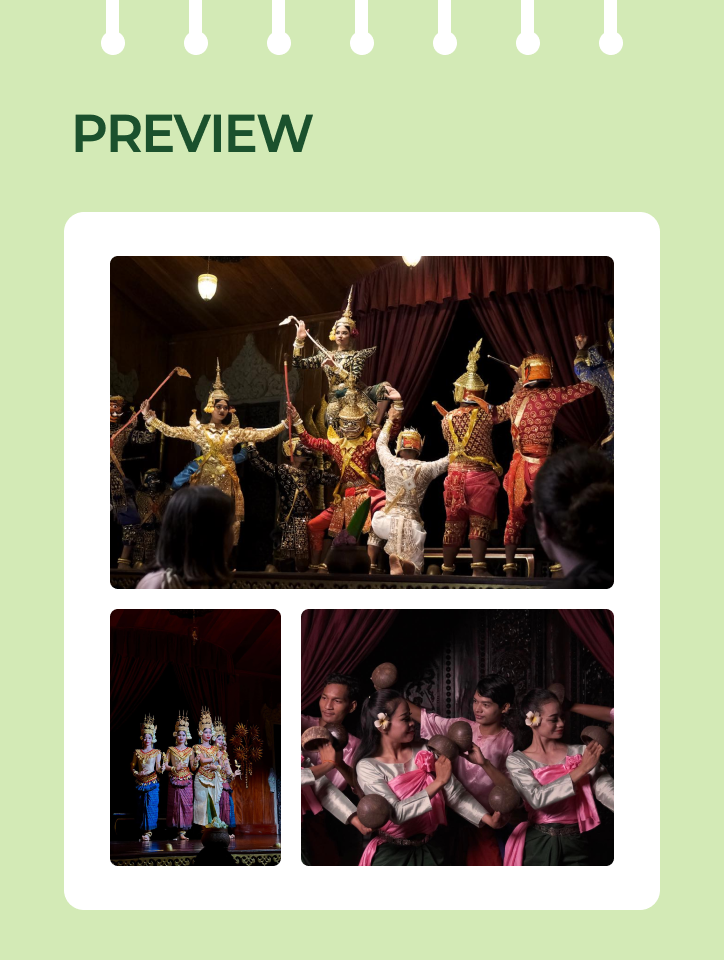 앙코르 시대 신화와 전설을 표현한 무용극은 물론, 현지 악기와 노래가 어우러져 캄보디아 전통예술의 정수를 체험할 수 있습니다.