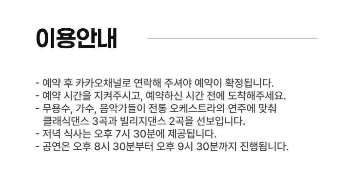 • 4월~10월 : 월, 수, 토요일 공연 / 15인 이상 단체 예약시 전요일 관람 가능