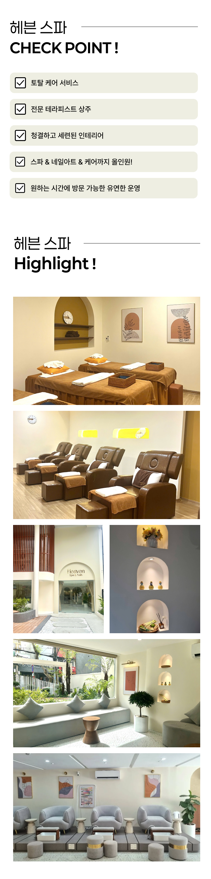🧴 마사지, 네일, 헤어까지 한 곳에서 관리 가능한 올인원 스파입니다.