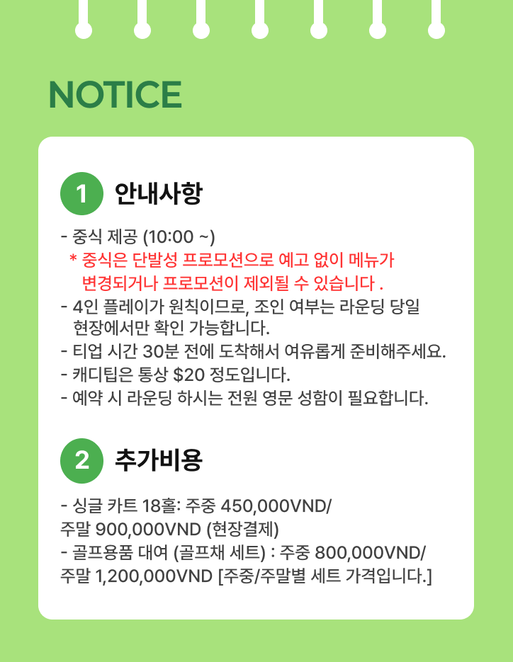 - 호텔 ↔ 골프장 왕복 차량은 미포함으로 별도 구매해주셔야 합니다.