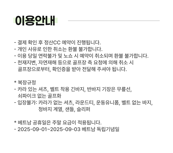 - 결제 완료 후 골프장에 예약이 실시간으로 진행되며, 예약 확정까지 시간이 소요될 수 있습니다.