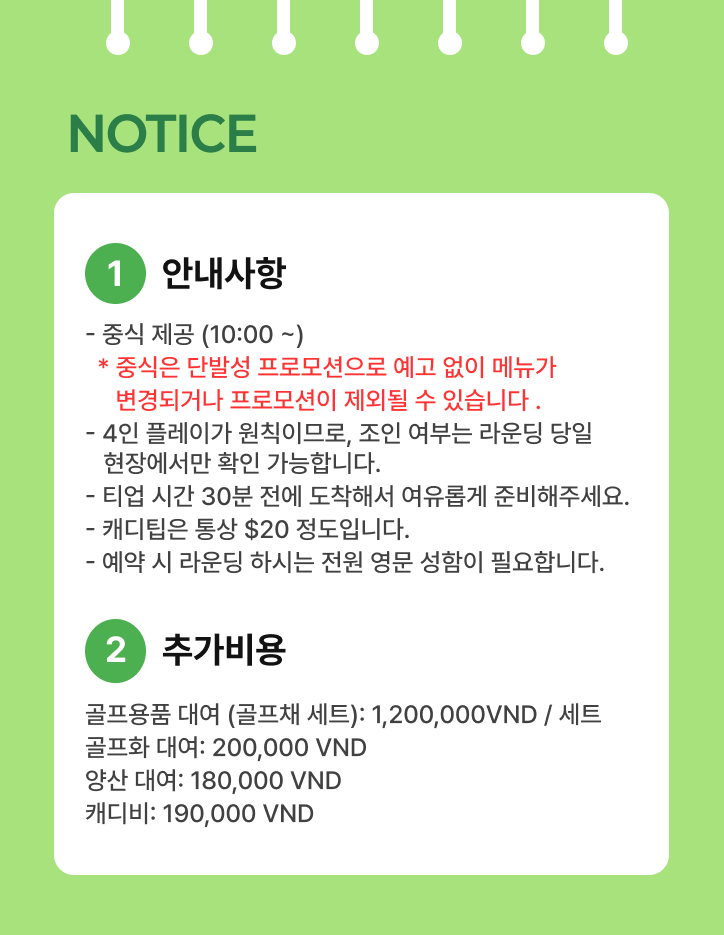 - 호텔 ↔ 골프장 왕복 차량은 미포함으로 별도 구매해주셔야 합니다.