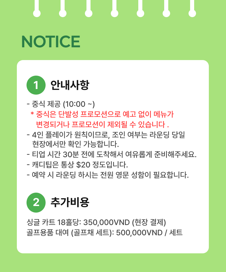 - 호텔 ↔ 골프장 왕복 차량은 미포함으로 별도 구매해주셔야 합니다.