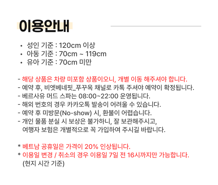 수건, 머드 스파 전용 의상, 마사지 가운, 헤어캡, 샴푸 및 바디워시 등 제공