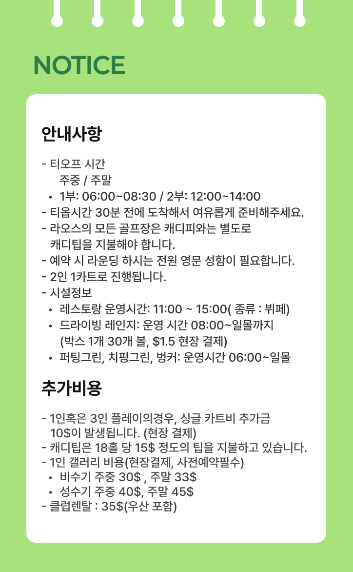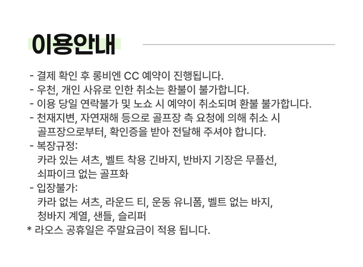 - 4인 미만 예약 시 골프장 요청에 따라 조인 될 수 있습니다. (라운딩 당일 확인 가능)