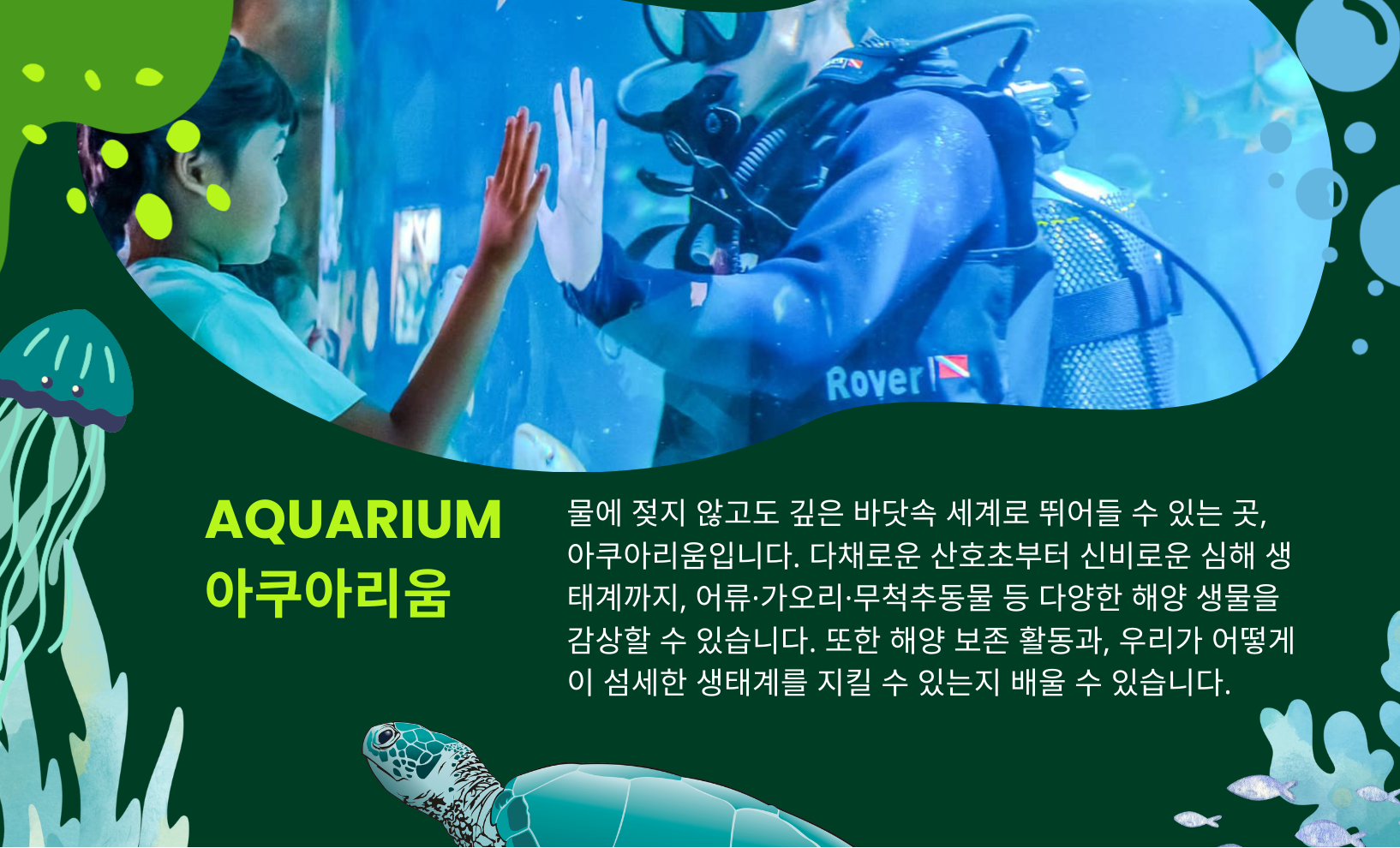 ✦ 아쿠아리움 체험 : 다양한 열대어와 해양 생물을 관찰하며 바닷속 생태계를 배워요.