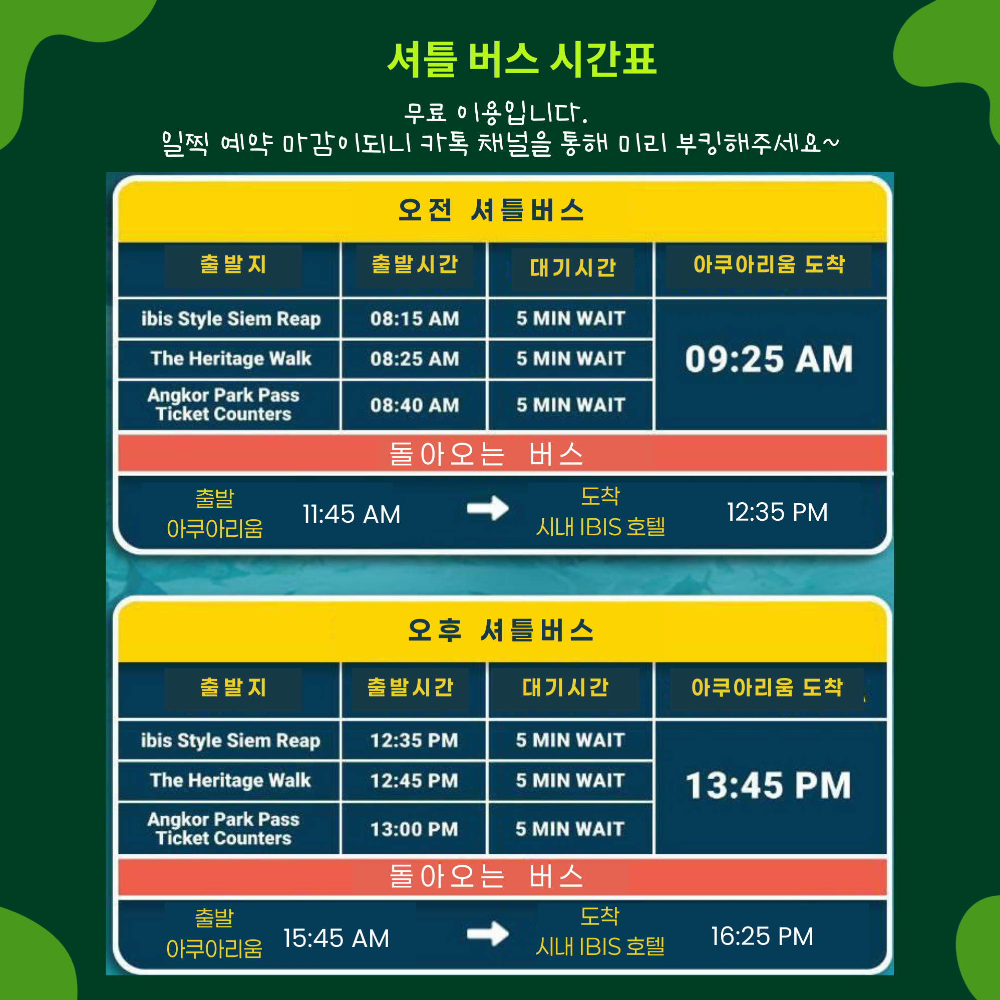 시내 출발시간 : ibis Style Siem Reap 12:35 / The Heritage Walk 12:45 / Angkor Park Pass Ticket Counter 13:00