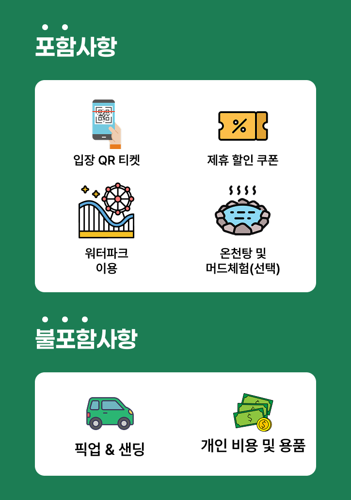 - 워터파크 전 구역 이용 (슬라이드, 파도풀, 레이지리버, 워터 플레이존등)