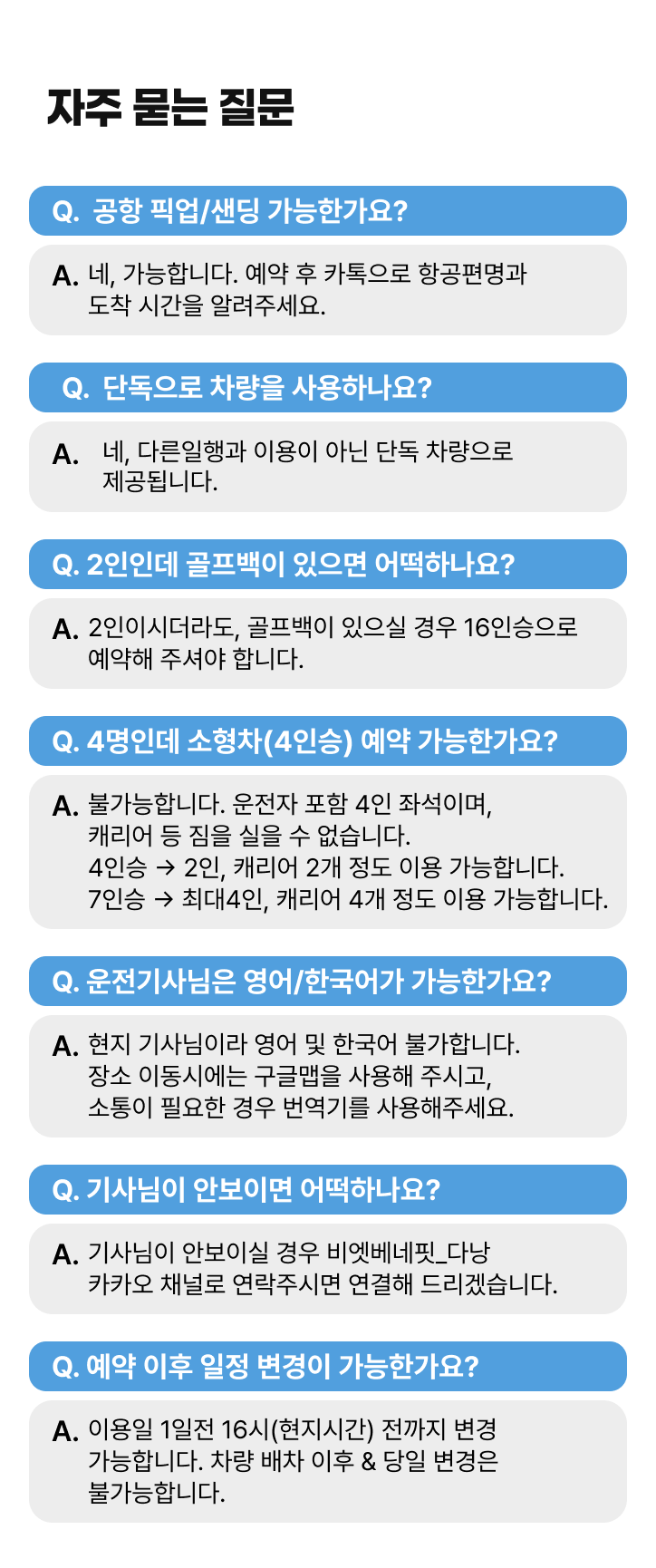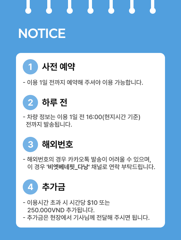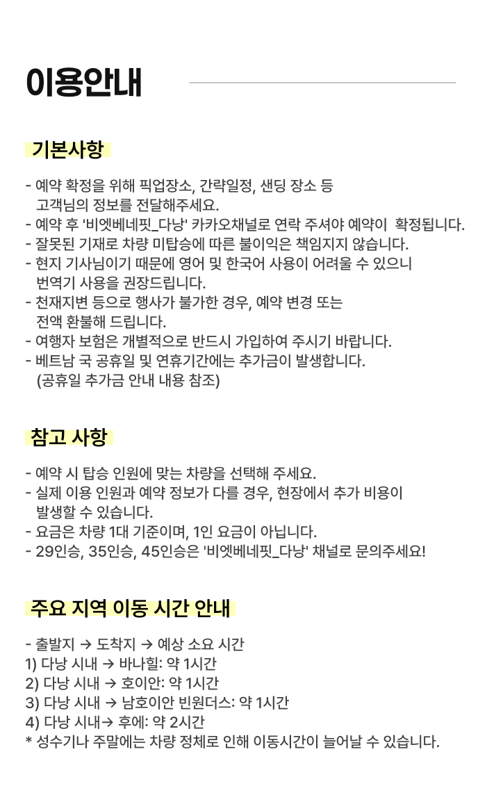 🚗 프라이빗 전용 차량으로 내 마음대로! 1️⃣ 낯선 다낭에서 이동 고민은 끝. 우리 일정대로, 우리끼리 편하게 2️⃣ 그랩 찾느라 시간 쓰지 말고, 여행에만 집중하세요. 3️⃣ 기사 포함 단독 차량으로 내가 원하는 일정과 코스대로 자유롭게! 📣 투어 구매 후 예약 확정을 위해 '비엣베네핏_다낭' 카카오채널로 연락 주세요:)